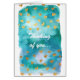 Acuarela azul, "pensando en usted," tarjeta, con confeti del corazón del oro.
