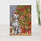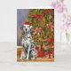 Esta tarjeta de Navidades muestra un retrato acuarela de un dálmata con un sombrero de Santa Claus sentado debajo de un árbol de Navidad.