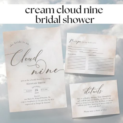 Esta elegante y caprichosa invitación es perfecta para el nuevo tema "sobre la nube 9". Cuenta con un fondo en la nube de acuarela y un texto con guiones rápidos.