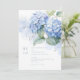 Moderno y elegante. Esta hermosa tarjeta de invitación a una boda plana presenta un ramo floral de hortensias azules frescas en flor, contra acentos de color azul. Un conjunto de fuentes contemporáneas crea un tono moderno y fresco.