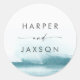 Estos modernos sellos para sobres bodas verde azulados de acuarela son perfectos para un boda contemporáneo y elegante. La colección de diseño minimalista, clásico y elegante presenta trazos de pincel de color agua en tonos bonito. Personalice la etiqueta con los nombres de la novia y del novio.