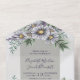 Todo en una sola invitación a la boda. Flores color agua morado y gris margarita.