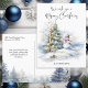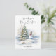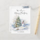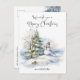 Un muñeco de nieve sonriente con pino y un árbol de pino adornado con un mensaje de caligrafía de Feliz Navidad.