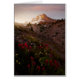 Impresionante imagen de acuarela digital de un paisaje nevado de puesta de sol en el valle montañoso, que incluye espías rojas y flores brillantes rosas y amarillas.