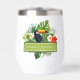 El diseño de un tumbler de vino termal colorido, boda, presenta un marco horizontal verde y marfil bordeado por flores de hibiscus acudiales, unas hojas de palma toscanas y exuberantes. Añada los nombres de la novia y del novio y la fecha del boda utilizando la plantilla proporcionada. Este diseño tropical es perfecto para el jardín de verano, la playa y bodas tropicales, cumpleaños y otros eventos especiales. Busque ID577 para ver productos coincidentes.