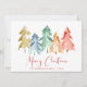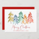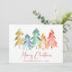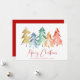 Una carta artística de vacaciones minimalista con acuarelas abstractas de pinos Navidades en oro, rojo, azul, verde y naranja, "Feliz Navidad" está escrita en un elegante guión rojo y tu nombre y año.