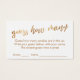 Estas tarjetas sutiles son apropiadas tanto para las duchas de bebés como para las de novias. Utilizando un moderno tipo de letra manuscrita, creé un superpuesto gráfico que dice "adivinen cuántos". Ha sido adornado con un falso efecto Relieve metalizado de oro. Debajo están las instrucciones para el juego y otro campo para las suposiciones y nombres de los jugadores. La espalda estaba cubierta con un sutil efecto falso Relieve metalizado de oro oscuro. Hay una opción alternativa debajo del gráfico, si desea considerar algo con un resultado más audaz. También puede optar por eliminar la imagen de fondo y dejar la parte posterior blanca. // 100 // Diseñado por Melody Watson para la Muserie de papel.
