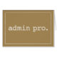 Un título simple, una definición simple pero una habilidad complicada que va al trabajo de un administrador Pro. Esta simple tarjeta revela la definición de Admin Pro como usted dice gracias. Centrado en el frente está la palabra Admin Pro en un fondo marrón moreno y con un marco de línea simple.