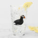 Un bonito charco de Puffin en el pecho ilustrado desde la vista lateral. La cabeza de este pájaro de bonito se gira para mostrar su marca de pico. El pájaro está dejando una ola de agua. El ataúd encorvado también se conoce como el ataúd tufado debido a las largas plumas de plumas en la cabeza.