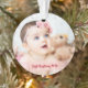 Moderno, elegante pero también adorable Ornamento de la Primera Niña de Navidad con una banda rosa parcialmente transparente, y una imagen y texto que puedes personalizar con una foto de una niña, su nombre y el año de su primera Navidad (o el nombre de una fiesta diferente). En la parte de atrás puedes subir una segunda foto. Las dos fotos se colocan dentro de un cuadro de copos de nieve de moda y estrellas.
