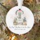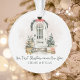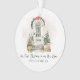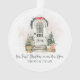 Celebre nuevos comienzos con este adorno personalizado de "Nuestra primera Navidad en nuestra nueva casa" con una gráfica decorativa de puerta principal con estilo de acuarela, decorada para las fiestas. La puerta se puede personalizar con el año o el número de dirección de la casa. Es personalizable con el nombre de la pareja en una fuente serif verde oscuro, también se puede poner el año debajo del nombre de la pareja. La parte posterior está personalizada con el nombre de la pareja.