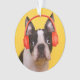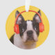 Esta linda foto de Getty Images muestra un Boston Terrier con auriculares rojos.