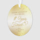 Conmemoración de cualquier aniversario boda con este adorno conmemorativo de oro y blanco que presenta un elegante diseño tipográfico de escritura de caligrafía dorada # AÑOS EN PARA SIEMPRE por sus años casados y acentuados con oro entrelazados corazones y confetti y personalizado con sus nombres y fechas u otro texto personalizado en la parte delantera y una foto en la parte posterior. El título es editable para cualquier año de aniversario. Póngase en contacto con el diseñador a través de Zazzle Chat o makeitaboutyoustore@gmail.com si desea modificar este diseño o en otro color, en otro producto o desea coordinar elementos.