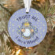 Viejo mago con capa azul mirando la bola mágica de cristal.
