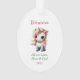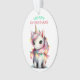Este es un adorable adorno navideño para que padres o abuelos se lo den a un niño. La parte delantera del adorno tiene una imagen de un adorable bebé unicornio envuelto en una hilera de coloridas lámparas de colores pastel. El texto verde menta y rosa dice "FELIZ NAVIDAD". La parte posterior del ornamento tiene el texto personalizado que está separado por otra imagen de unicornio. ¡Cambia fácilmente el texto a lo que quieras!