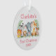 Ornamento de animales de la primera acuarela navideña para bebes Safari. Los animales bebés incluyen elefante, mono, jirafa, rinoceronte, cebra y león en hojas de helecho. Vegetación botánica acuarela. Texto rosado. Añadir nombre.