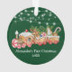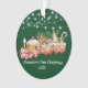 El Baby First Christmas Ornament incluye el tren Watercolor Gingerbread con caramelos, galletas y pinos. Luces de cadena en un fondo verde forestal.
