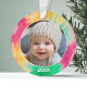 Añade un cuadro a esta bonita decoración de vacaciones, perfecta para los niños. Un divertido y colorido borde de acento de tintes de corbata hace un adorno memorable para tu árbol. Una moderna letra mínima para el año con un lugar para subir una foto cuadrada.