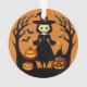 Un caprichoso ilustracion de temática de Halloween que presenta una bruja con calabazas, murciélagos y árboles misteriosos en un fondo naranja.