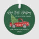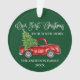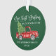 Moderno caligrafía de diversión Guión Nuestra primera Navidad en nuestro nuevo ornamento residencial incluye Watercolor Vintage Camión Rojo con Árbol de Navidad. Fondo verde forestal.