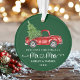 Caligrafía moderna Script Corazón de nuestra primera Navidad como Sr. y Sra. - Ornamento de Camión Rojo Vintage Watercolor - Fondo Verde Forestal