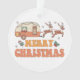 Camping Merry Christmas Reindeer Typography Ornament (Ornamento de tipografía de renos navideños) presenta el texto "Feliz Navidad" en una tipografía de escritura retro con una caravana decorada festiviblemente arrastrada por renos y acentuada con copos de nieve y holly. Diseñado por Evco Studio www.zazzle.com/store/evcostudio