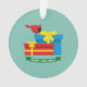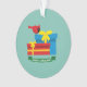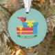 Cardenal rojo lindo abriendo un regalo azul con cinta amarilla. Un cartel rojo saludando a "MERRY NAVIDAD" completa el diseño. ¿Cuál es tu regalo para los Navidades?