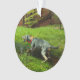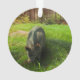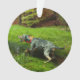 El perro Catahoula espia al cerdo salvaje en el bosque y empieza a ladrar fuerte en el cerdo salvaje desde una distancia segura. El Catahoula se encuentra a un lado del adorno, mientras que el cerdo está al otro lado.