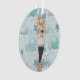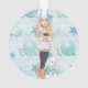 La diversión y festivo, este dibujo de un chica rubio lindo en un suéter holgado que sostiene una taza de café, llevando una gorrita tejida de la turquesa, los vaqueros y las botas negros del moreno, al lado de un perrito blanco, se opone a un fondo de la turquesa de estrellas y de ornamentos del navidad.