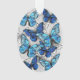 Composición vertical de mariposas morfo realistas, azules y blancas sobre fondo texturado gris. Mariposa morfo azul.