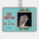 Este adorno navideño fotográfico presenta un marco fotográfico de personalizable acentuado con guirnaldas y baudias coloridas en la parte superior e inferior. El texto leído (sobre y sobre fondo verde azulado ligero) dice: Primera Navidad como señor y señora 2014. El año es personalizable.