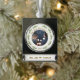 Festividad Nuestro Primer Ornamento De Banner Plateado Con Guión De Navidad. El diseño con ramas de pino de árbol de Navidad en un círculo, foto en un marco circular, escritura dorada moderna - personaliza el adorno con tu foto y texto.
