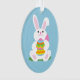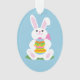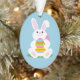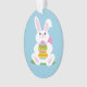 Un lindo conejito de Pascua con un lazo de arco rosado tan feliz que sostiene un Huevo de Pascua decorado con colores de primavera lleno de dulces sentados en un parche de hierba verde con un roble círculo azul de huevo. Regala el árbol de Pascua a un pequeño o gran chica o a una familia o amigo para desearles una Pascua Feliz.