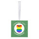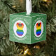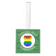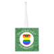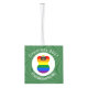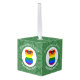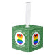 Artículo decorativo de Navidad de un adorno de cubo con un ángel africano vestido con la colorida bandera del arcoíris del Orgullo Gay. El ángel africano del Orgullo Gay de Navidad vuela en un círculo blanco de cuadrados ondulados rodeado de un fondo de cuadrados ondulados verdes. Agrega tu propio texto, o personaliza con un nombre y personaliza con el año.