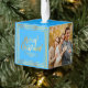 Muestra tus fotos favoritas de vacaciones familiares en este adorno de cubo de fotos adornado por el personalizado. El fondo está hecho en azul turquesa con acentos dorados y texto gráfico que lee Feliz Navidad y 2021 en oro. Las franjas fotográficas de los personalizados, en los lados derecho e izquierdo del adorno están listas para personalizar con las fotos de su familia.