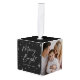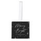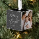Ornamento moderno de cubo de fotos de vacaciones con "Merry and Bright" mostrado en un guión con letras a mano rodeado por un borde de estrellas blancas contra un fondo negro. Personalice la parte delantera del adorno añadiendo su apellido y el año. Añade 3 de tus fotos favoritas para crear el placer perfecto para regalar a amigos y familiares.