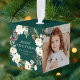 Elegante ornamento de fotos de vacaciones con una corona de flores acuáticas de color marfil, frondosas frondosas vegetaciones, conos de pino y bayas holly que rodean la frase "Feliz Navidad" o tu saludo elegido con un fondo verde. Personaliza el adorno botánico de vacaciones añadiendo tu apellido, el año y 3 de tus fotos familiares favoritas.