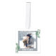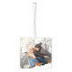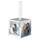 Este adorno de Navidad afilado ofrece un diseño de tu primera Navidad juntos como una pareja comprometida. El cubo presenta tres lados para las fotos y el cuarto para los nombres y el año y se acentúa con el color gris plateado.