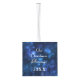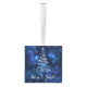 Este elegante adorno cúbico tiene sus propias fotografías en la parte delantera y trasera. Entre las fotos de los lados restantes se encuentra un fondo estelar de estilo bokah azul oscuro bonito y plata. A la derecha hay una imagen de un árbol giratorio plateado. Los lados izquierdo y derecho tienen campos de texto en plata para que usted los personalizar... ¡que diga lo que quiera! La parte superior e inferior también muestran el fondo azul del patrón, pero sin el texto. ¡Un maravilloso recuerdo anual para tu familia!