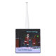 Santa Claus se ve en el tejado de una casa después de entregar regalos. Las luces rojas y verdes de navegación de su trineo se reflejan en la nieve de la azotea, y la placa personal de Santa Polo Norte es visible. El texto que dice "Saludos de temporada" también aparece junto con un lugar para tu propio texto.