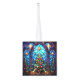 Aquí tiene la ventaja de dos imágenes de vidrio manchado en dos lados de este adorno de cubo. La parte superior es una imagen propia. El fondo es un azul claro