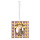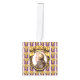 La obra de arte original de ZoeSPEAK en este Cube Ornament incluye un retrato del compositor de música clásica Wolfgang Amadeus Mozart. El retrato es un perfil enmarcado en un marco dorado oval ornamentado. El marco cuelga sobre un fondo de papel pintado de color púrpura con racimos dorados de uvas en filas y rayas verticales blancas y lavanda.