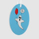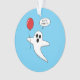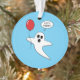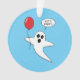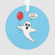 A cute cartoon ghost bringing a red balloon, saying "LET'S PARTY!". This illustration is good for Halloween celebration.