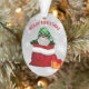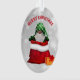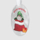 Un adorable gnomo blanco barbudo vestido con un sombrero de Santa copa de nieve verde y blanco sale de una bolsa de regalo roja en la parte delantera de este adorno navideño. El texto encima de la imagen dice "FELIZ NAVIDAD" en rojo. La imagen y el texto se colocan en un fondo de bokeh abstracto plateado. La parte posterior del ornamento tiene el mismo fondo, con una imagen de bombillas de árbol de vacaciones y cinta, y varios campos de texto para que el personalizar. Esto hace un gran adorno de obsequio para una hija, un hijo o un nieto.