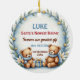 Celebrate your little one’s first holiday season with our Bear Hugs & Baubles custom ceramic ornament. This charming keepsake features your baby’s photo framed by a festive wreath of green leaves, white flowers, and golden berries, with two cozy teddy bears in winter scarves nestled beside a wrapped gift. It’s a heartwarming blend of seasonal sparkle and childhood wonder—perfect for commemorating your child’s first Christmas with love and joy.