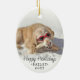 Celebra las simples alegrías de tu peludo miembro de la familia con un adorno de cerámica ovalada personalizado 2. Las imágenes de texto y perro de esta plantilla son fáciles de personalizar y pueden ser diferentes o iguales en el frente y en la parte posterior. Si lo prefiere, cambie "Humbug de Bark" y "Happy Howlidays" por "Feliz Navidad" u otro texto. El ornamento también puede utilizarse para cualquier mascota, como un gato o un hámster, o como monumento conmemorativo. El diseño presenta un overlay en blanco y negro, una tipografía de escritura elegante, un estilo de máquina de escribir minimalista moderno, nombre y año, y 2 imágenes de su elección. Este único amante del perro añade un toque elegante a la decoración de casa de Navidad.