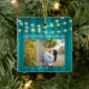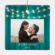 Celebre la alegre primera fiesta de su compromiso con un personalizado 2 fotos de "Nuestra Primera Navidad Comprometida" verde azulado adorno de cerámica cuadrada de parqué. Este diseño presenta un elegante fondo verde azulado de granos de madera con luz Navidad, caligrafía de estilo manuscrito, los nombres de la pareja y el año, y dos imágenes de su elección. Este boda único añade un toque elegante a las decoraciones caseras de Navidad.