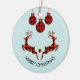 Ornamento de Navidad que dice "Feliz Navidad" en texto curvo. Diseñado con un ilustracion de 2 ciervos Navidades saltando. Los ciervos están hechos de leñadores rojos y negros, con un poco de corazón entre ellos. Las decoraciones de Navidad rojas y negras se cuelgan desde arriba.