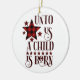 Para nosotros, un niño nace en la tipografía negra con estrellas rojas y negras de manto de búfalo. Personalice la parte posterior de este ornamento añadiendo su propio mensaje. Este diseño también está disponible para toda la familia en camisetas, capuchas, sudaderas, trajes para bebés, decoración en casa y decoración navideña. ¡Perfecto para celebrar a los Navidades de Cristo!