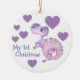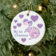 ¡Aquí hay un adorable adorno para conmemorar a los primeros Navidades del bebé! La parte delantera del adorno tiene una imagen de un adorable dinosaurio de bebé morado. El dino está rodeado de corazones morados, y el texto personalizado actualmente dice "Mis primeros Navidades". La parte posterior tiene más corazones, además de su propio texto personalizado en varios campos. Todo el texto se cambia fácilmente a lo que quieras.